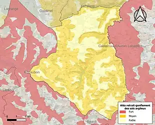 Le retrait-gonflement des sols argileux est susceptible d'engendrer des dommages importants aux bâtiments en cas d’alternance de périodes de sécheresse et de pluie. 66,6 % de la superficie communale est en aléa moyen ou fort (19,2 % au niveau départemental et 48,5 % au niveau national). Sur les 290 bâtiments dénombrés sur la commune en 2019, 193 sont en aléa moyen ou fort, soit 67 %, à comparer aux 17 % au niveau départemental et 54 % au niveau national. Une cartographie de l'exposition du territoire national au retrait gonflement des sols argileux est disponible sur le site du BRGM[20],[Carte 2].