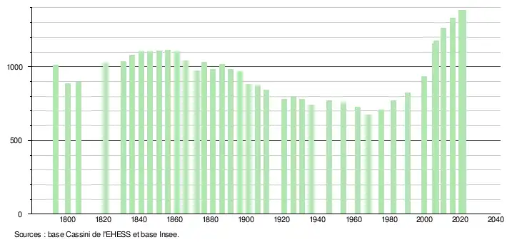 L'évolution du nombre d'habitants est connue à travers les recensements de la population effectués dans la commune depuis 1793. Pour les communes de moins de 10 000 habitants, une enquête de recensement portant sur toute la population est réalisée tous les cinq ans, les populations légales des années intermédiaires étant quant à elles estimées par interpolation ou extrapolation[22]. Pour la commune, le premier recensement exhaustif entrant dans le cadre du nouveau dispositif a été réalisé en 2005[23].