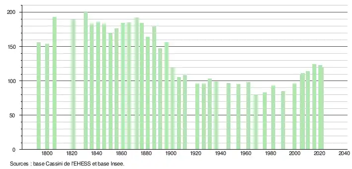 L'évolution du nombre d'habitants est connue à travers les recensements de la population effectués dans la commune depuis 1793. Pour les communes de moins de 10 000 habitants, une enquête de recensement portant sur toute la population est réalisée tous les cinq ans, les populations légales des années intermédiaires étant quant à elles estimées par interpolation ou extrapolation[18]. Pour la commune, le premier recensement exhaustif entrant dans le cadre du nouveau dispositif a été réalisé en 2005[19].