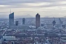 Le quartier d'affaires de la Part-Dieu (Lyon 3e), et ses immeubles de grande hauteur en 2021 : de gauche à droite, la tour Silex 2, la tour To-Lyon en travaux, la tour Part-Dieu, dit « le crayon », la tour Incity et la tour Oxygène.
