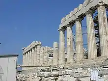 Le Parthénon est un bâtiment dorique périptère octostyle, avec des traits architecturaux ioniques. Il abritait la statue chryséléphantine d'Athéna Parthénos sculptée par Phidias et consacrée en -439/-438.