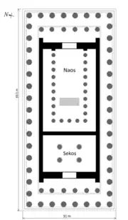 Le sékos (partie fermée de l'édifice) est surélevé de deux degrés. Il est amphiprostyle, c'est-à-dire que sa colonnade est limitée aux petits côtés, et hexastyle (6 colonnes ioniques[N 4] plus hautes et plus étroites d'un tiers que les colonnes doriques)[27]. Sa nef centrale a une portée de onze mètres, encore jamais atteinte à l'époque ; ses étroites nefs latérales sont éclairées par deux fenêtres (9,75 × 4,20 m) de part et d’autre de la porte d’entrée, qui éclaire l’espace central. Le naos, large de 9,815 m., est entouré d'une colonnade faisant un retour derrière la statue[23].