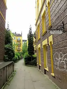 Dans un espace délimité par des bâtiments, des allées peuvent être implantées dans les jardins et espaces verts. La conception de circulation par des terrasses s'est retrouvée par exemple avec le passage séparé entre piétons et véhicules de l'urbanisme sur dalle unifiant des bâtiments disparates.