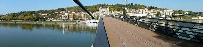 En 1842, la municipalité de Trévoux planifie[2] la construction d'un pont suspendu sur la Saône. Sa construction selon les plans de l’ingénieur Paul-Léon Lehaître[3] débutera[2] en 1850 et sera achevée en 1851 : après une phase de test en [2], l'inauguration de la passerelle a lieu[2] le .