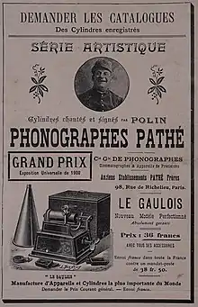 En 1894, les frères Pathé ont commencé à vendre leurs propres phonographes. Les premières offres Pathé étaient des cylindres de phonographe[2]. Pathé a fabriqué des disques cylindriques jusqu'en 1914 environ. Pathé ne s'est pas simplement limité aux enregistrements de cylindres de taille standard (57 mm de diamètre). Il y avait également les enregistrements «Salon», qui mesuraient 3½ pouces de diamètre et les enregistrements «Stentor» plus grands et qui mesuraient 5 pouces de diamètre. Les disques "Le Céleste", les plus grands disques cylindriques commerciaux fabriqués par n'importe quelle société de phonographes, mesuraient 5 pouces de diamètre par 9 pouces de long[3].