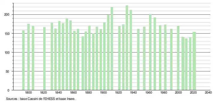 L'évolution du nombre d'habitants est connue à travers les recensements de la population effectués dans la commune depuis 1793. Pour les communes de moins de 10 000 habitants, une enquête de recensement portant sur toute la population est réalisée tous les cinq ans, les populations légales des années intermédiaires étant quant à elles estimées par interpolation ou extrapolation[14]. Pour la commune, le premier recensement exhaustif entrant dans le cadre du nouveau dispositif a été réalisé en 2005[15].