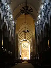 Toutes les autres églises de Lille sont d’origine récente, à commencer par la cathédrale Notre-Dame-de-la-Treille, dont la construction débute en 1854 pour s’achever en 1999, près de 150 ans plus tard[22]. Elle doit son existence à la volonté de la bourgeoisie industrielle lilloise d'ériger une somptueuse église dans le style gothique du XIIIe siècle, inspiré de Viollet-le-Duc, afin de susciter la création d'un évêché à Lille et son nom à une statue de la Vierge du dernier quart du XIIe siècle vénérée depuis le XIIIe siècle pour les miracles qui lui sont attribués. Mais le projet connaîtra de nombreuses péripéties de sorte qu’après un siècle de travaux, le projet est loin d'être achevé et doit être révisé. Finalement, ce n’est qu’en 1991 que la décision de terminer la façade est prise par l’association diocésaine de Lille. Elle retient un projet de style résolument moderne, composé d’une ogive de 30 mètres de haut tapissée de 110 plaques de marbre translucide que soutient une structure métallique. Il en résulte un édifice composite, pour partie temple néogothique à la gloire de l’industrie, pour partie hymne à la technologie moderne. Les nombreuses mosaïques sont à cet égard particulièrement remarquables. Par ailleurs, la cathédrale héberge depuis 2008 le Grand Orgue du studio 104 de la Maison de la Radio, qui compte parmi les plus grandes orgues de France. Dotée d’une crypte de 2 500 m2, elle accueille également le centre d'art sacré contemporain qui présente des œuvres sur le thème de la Passion.