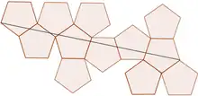La difficulté peut alors être de trouver lequel des différents patrons possibles d'un solide donné est pertinent pour résoudre le problème, voire parfois quelle juxtaposition de patron sera utile. Un exemple de cela est l'étude des géodésiques fermées sur le dodécaèdre régulier, où l'on se demande s'il est possible d'aller « en ligne droite » d'un sommet du dodécaèdre à lui-même sans passer par un autre sommet. L'inexistence de telles trajectoires était établie pour les quatre autres solides platoniciens depuis 1936 mais est restée ouverte pour le dodécaèdre jusqu'en 2019[16]. Il existe en fait 31 classes de telles géodésiques pour le dodécaèdre régulier[17],[18], la plus simple pouvant se représenter sur un patron bien choisi[19].