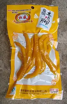 Les pattes de poulet sont appelées de différentes manières en chinois : fèng zhuǎ (鳯爪, griffes de phœnix), jī zhuǎ (鷄爪, griffes de poulet), et jī jiǎo (雞脚, pieds de poulet).