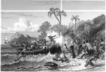 La mort de Fleuriot et de dix de ses hommes sur les plages de Manoua en 1787. (Gravure de N. Ozanne, 1797)