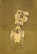 Selon Rainer K. Wick[alpha 5], qui tient ses informations d'Eugen Batz[alpha 6] et de Kurt Kranz[alpha 7] : « Klee était tout sauf un enseignant[45]. » D'après ses anciens élèves, il semble que le fait d'enseigner lui coûte, ce qui n'empêche pas le peintre d'être un pédagogue de premier ordre. Une des raisons de son succès ne tient pas dans sa méthode, mais dans la richesse de sa pensée et la logique de son enseignement. En 1920, Paul Klee est invité par télégramme à rejoindre Gropius. Il commence son activité au début de 1921 dans cette école, la plus progressiste d’Allemagne, et la quitte dix ans plus tard[46]. Assez peu engagé politiquement, Klee se tient en retrait de tout ce qui se passe quotidiennement au Bauhaus et des grands évènements sociaux et politiques de l'époque, à l'exception d'une conférence donnée à Iéna en 1924[alpha 8], où il souhaite que le « Bauhaus parte à la conquête du peuple » et d'une œuvre ouvertement anti-hitlérienne, une caricature de Hitler déformé : L'Habitué (1931), craie sur papier marouflé, carton avec tache de colle, Kunstmuseum (Berne)[47].