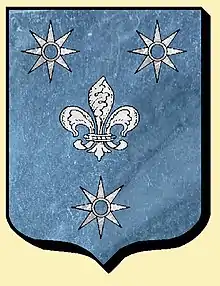 - D'azur à 3 molettes d'argent, une fleur de lis de mesme en abisme