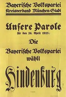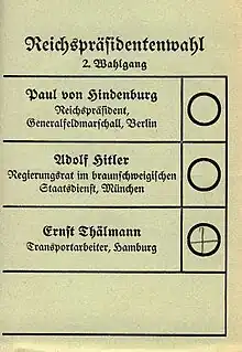 Auréolé de son prestige militaire que la défaite de l'Empire allemand n'a pas affecté, le maréchal von Hindenburg est élu président du Reich à l'issue du scrutin présidentiel d'avril 1925 ; il succède au social-démocrate Friedrich Ebert, décédé dans l'exercice de ses fonctions. Aisément réélu pour un second septennat, le président Hindenburg n'empêche cependant pas l'ascension politique d'Adolf Hitler, qu'il nomme chancelier du Reich. À sa mort en 1934, Hitler occupera la fonction de président du Reich et s'octroiera ainsi tous les pouvoirs de facto par plébiscite le 19 août 1934, sans pour autant supprimer le poste de jure, puisqu'il sera occupé par Karl Dönitz lors de la dernière semaine du Troisième Reich.