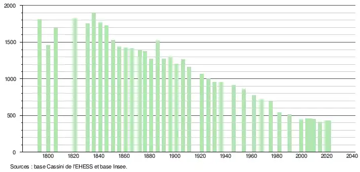L'évolution du nombre d'habitants est connue à travers les recensements de la population effectués dans la commune depuis 1793. Pour les communes de moins de 10 000 habitants, une enquête de recensement portant sur toute la population est réalisée tous les cinq ans, les populations légales des années intermédiaires étant quant à elles estimées par interpolation ou extrapolation[12]. Pour la commune, le premier recensement exhaustif entrant dans le cadre du nouveau dispositif a été réalisé en 2004[13].