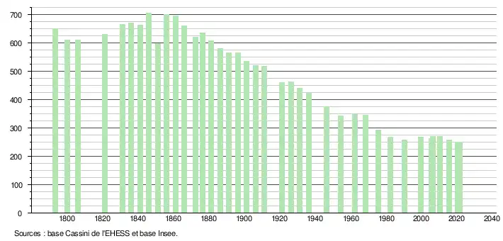 L'évolution du nombre d'habitants est connue à travers les recensements de la population effectués dans la commune depuis 1793. Pour les communes de moins de 10 000 habitants, une enquête de recensement portant sur toute la population est réalisée tous les cinq ans, les populations légales des années intermédiaires étant quant à elles estimées par interpolation ou extrapolation[48]. Pour la commune, le premier recensement exhaustif entrant dans le cadre du nouveau dispositif a été réalisé en 2005[49].