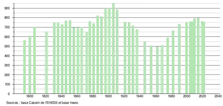 L'évolution du nombre d'habitants est connue à travers les recensements de la population effectués dans la commune depuis 1793. Pour les communes de moins de 10 000 habitants, une enquête de recensement portant sur toute la population est réalisée tous les cinq ans, les populations légales des années intermédiaires étant quant à elles estimées par interpolation ou extrapolation[20]. Pour la commune, le premier recensement exhaustif entrant dans le cadre du nouveau dispositif a été réalisé en 2004[21].