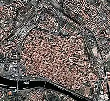 Photo aérienne du centre historique de Pavie, vous pouvez voir le tracé urbain de l'époque romaine.