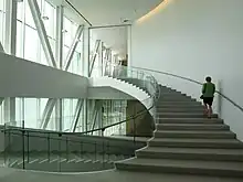 La spirale d’un monumental escalier de 79 marches[41] au garde-corps transparent, s’élance sur trois niveaux, d’une mezzanine à l’autre, depuis le sous-sol.