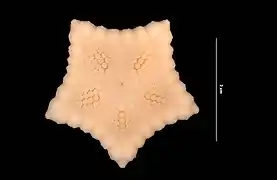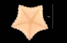 C'est une petite étoile de mer plate, rigide et pentagonale, aux bras soudés. Sur toute sa périphérie, elle est entourée par d'épaisses plaques grossièrement quadrangulaires. Le disque central est aplati et présente une mosaïque de plaques plus ou moins hexagonales. Sur la face orale (inférieure), les 5 sillons ambulacraires (d'où émergent les podia) sont bien marqués. L'ensemble du corps est structuré par des plaques squelettiques assez visibles.