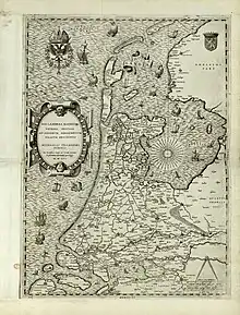 - Passé sous l'autorité des ducs de Bourgogne qui avaient concentré, par droits d'héritage et manœuvres politiques, les divers comtés, duchés et marquisats qui composaient le pays, l'ensemble porte le nom de Leo Belgicus. Charles Quint, né à Gand, et considéré par les habitants des Pays-Bas comme leur roi, dote le pays d'une personnalité juridique par la Pragmatique Sanction. Cependant, le pays se scinde à la suite des guerres contre la monarchie espagnole qui avait échu, à la mort de Charles Quint, à son fils Philippe II. Cette situation, résultant de la guerre de Quatre-Vingts Ans contre l'autorité espagnole, s'est marquée sur les cartes par la naissance de la Belgica Regia.