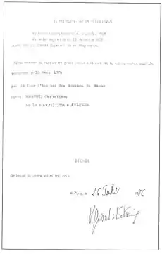 En revanche le rejet de la grâce n'était pas un décret mais une simple « décision », la signature du seul Président suffisait donc à la rendre valide. Georges Pompidou dut ainsi menacer de démissionner pour empêcher le général de Gaulle de faire exécuter Edmond Jouhaud[34]. Ce paradoxe s'explique par le fait que pour les autres peines, il n'est pas besoin de signer quoi que ce soit pour rejeter une grâce ; ne rien faire suffit et le condamné reste en prison. Mais en matière de peine capitale, il fallait un document pour attester que la grâce avait été rejetée et ainsi mettre en œuvre l'exécution ; la « décision » avait valeur d'ordre d'exécution[35]. Le faire contresigner aurait été inepte dans la mesure où cet acte n'était pas prévu par la Constitution comme la grâce, mais seulement imposé tacitement par l'ancien article 713 du code de procédure pénale.