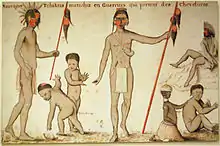 En Nouvelle-France, on utilise le verbe matacher et le nom de matachias pour désigner la peinture corporelle[2] (illustration ci-contre). Les peuples autochtones d'Amérique du Sud utilisent le huito ou genipapo (genipa americana), l'annatto ou le charbon pour leurs décorations corporelles. Le huito est, à l'instar du henné, assez durable et sa teinte noire met quelques semaines à s'effacer.