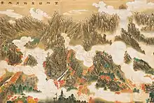 Un nouveau style de peinture de paysage apparaît aussi : reprenant les codes de représentation de l'espace architecturé intégré au paysage observé, d'usage en Occident. À la fin du siècle, An Jung-sik (1881-1919), dernier peintre de cour, réalise ainsi, auprès de riches familles, des paysages monumentaux dans un style qui intègre la tradition lettrée de l'encre, son travail subtil du pinceau et ses couleurs légères, à un usage limité de la perspective centrée à l'occidentale[64]. Il n'intègre ces nouveaux éléments qu'avec beaucoup de délicatesse, conservant tous les moyens de la tradition lettrée jusqu'en 1915, tandis qu'une peinture bien plus directement inspirée de l'occident s'approprie la peinture à l'huile, et se tourne vers le Japon au début du XXe siècle.
