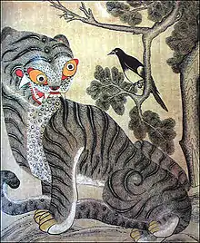 Depuis l'époque du royaume de Silla sous le roi Heonggang (r. 875-886), la tradition qui consistait à coller sur les portes une effigie du Roi Dragon, dieu de la variole, avait pour but de protéger la demeure des épidémies, et en particulier de la variole. Pendant la période Joseon des images de tigres et dragons se joignent à cette première coutume. Au Nouvel An lunaire et sur les deux faces de la porte on apposait une image du tigre et du dragon, le premier avait pour mission de chasser les esprits malveillants, quant au dragon il devait attirer les esprits favorables. De telles images constituent le genre minhwa.[réf. nécessaire]