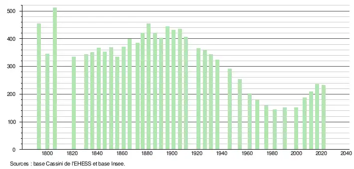 L'évolution du nombre d'habitants est connue à travers les recensements de la population effectués dans la commune depuis 1793. Pour les communes de moins de 10 000 habitants, une enquête de recensement portant sur toute la population est réalisée tous les cinq ans, les populations légales des années intermédiaires étant quant à elles estimées par interpolation ou extrapolation[26]. Pour la commune, le premier recensement exhaustif entrant dans le cadre du nouveau dispositif a été réalisé en 2006[27].