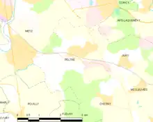 Peltre est un village à 5 km au sud-est de Metz, à l'ouest de la RD 955. Il a pour annexe le village de Crépy et possède plusieurs écarts :
