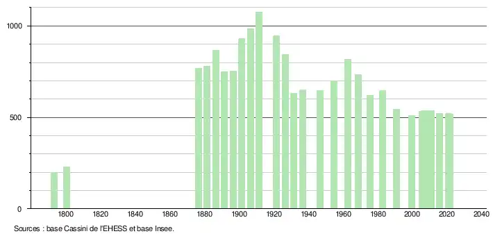 - Population municipale légale en vigueur au 1er janvier 2024, millésimée 2021, définie dans les limites territoriales en vigueur au 1er janvier 2023, date de référence statistique : 1er janvier 2021.