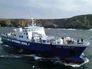 - En 1925, le nouveau navire tant attendu par les îliens arrive enfin. Il s’agit de l’Enez Eussa[4]. Ce navire long de 39 mètres, peut transporter jusqu’à 300 passagers. Construit en 1908 en Écosse, il est initialement destiné à assurer des croisières touristiques sur le lac Léman. Réquisitionné pendant la guerre, il assure l’acheminement des militaires vers les îles Chausey, sous le nom de Coccinelle. Coulé dans l’Elorn par les allemands en 1944, il est renfloué, équipé de deux moteurs Diesel, et reprend finalement du service entre 1946 et 1960.