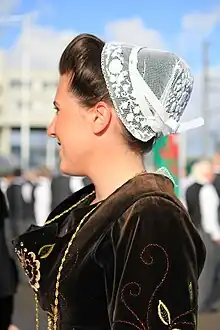 Le costume de fête se compose d'une coiffe, d'un corselet de soie ou de satin (de couleur), d'un grand châle noir brodé en mérinos fermé par un jabot de dentelle, d'une jupe de soie et d'un tablier de satin brodé[38].