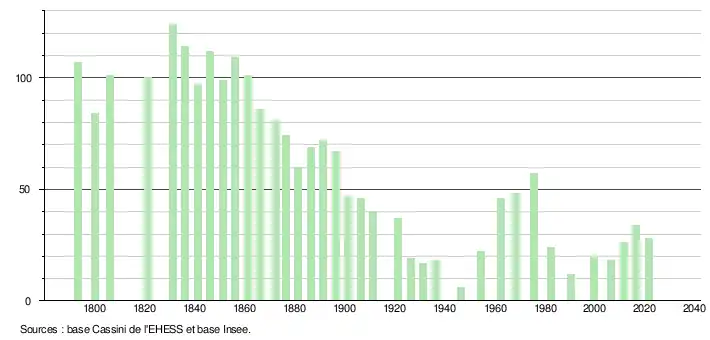 L'évolution du nombre d'habitants est connue à travers les recensements de la population effectués dans la commune depuis 1793. Pour les communes de moins de 10 000 habitants, une enquête de recensement portant sur toute la population est réalisée tous les cinq ans, les populations légales des années intermédiaires étant quant à elles estimées par interpolation ou extrapolation[18]. Pour la commune, le premier recensement exhaustif entrant dans le cadre du nouveau dispositif a été réalisé en 2006[19].