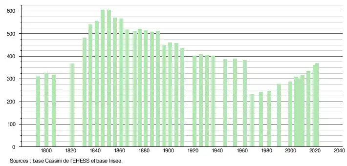 L'évolution du nombre d'habitants est connue à travers les recensements de la population effectués dans la commune depuis 1793. Pour les communes de moins de 10 000 habitants, une enquête de recensement portant sur toute la population est réalisée tous les cinq ans, les populations légales des années intermédiaires étant quant à elles estimées par interpolation ou extrapolation[21]. Pour la commune, le premier recensement exhaustif entrant dans le cadre du nouveau dispositif a été réalisé en 2004[22].