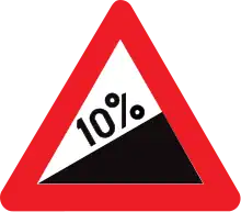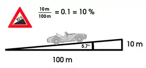 La valeur de la pente s'exprime souvent en pour cent[1],[2] : ce pourcentage se calcule en prenant la différence de hauteurs, ou d'altitudes, entre les deux extrémités du terrain concerné, divisée par la distance horizontale entre ces deux niveaux (prises dans la même unité de mesure), multipliée par 100, soit .