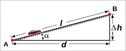 La pente peut encore être exprimée lorsque la distance horizontale n'est pas connue mais que l'on mesure la longueur sur le terrain entre les deux points d'extrémité d'altitudes connues : cette valeur permet de calculer le sinus de l'angle d'élévation, soit la dénivelée divisée par cette longueur, donc de connaître cet angle, donc d'établir la pente du terrain concerné : c'est la tangente de l'angle d'élévation. Lorsque cet angle est faible, inférieur à 17°, la différence entre la valeur de la tangente et celle du sinus est inférieure à 5 %, donc peu significative : dans ce cas, en première approximation, ces valeurs sont souvent considérées comme identiques[N 1]. Les rampes de chemin de fer sont souvent présentées dans ces conditions.