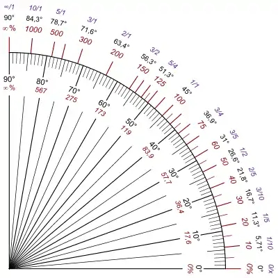 On utilise aussi, mais moins souvent, un angle en degrés. Dans ce cas, on ne parle normalement pas de pente, mais de l'angle d'élévation[1].