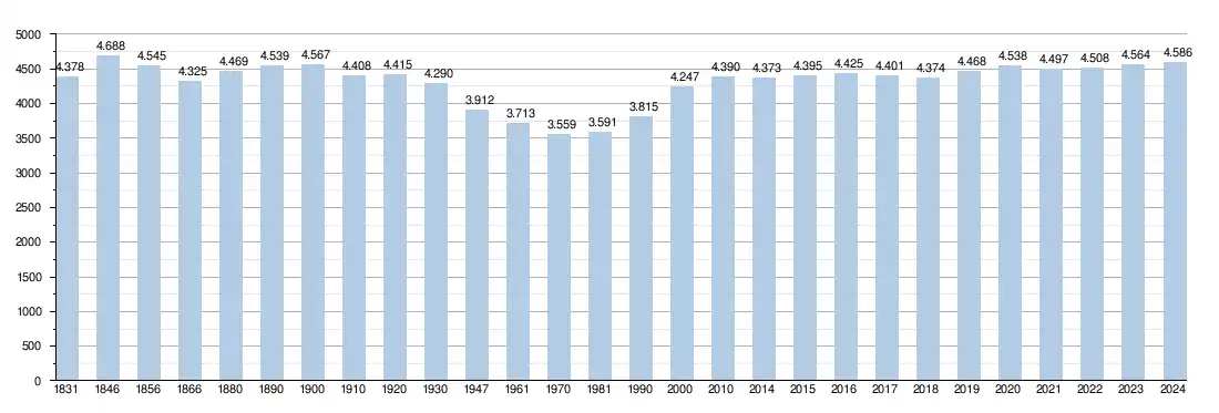 Elle comptait, au début 2024, 4 595 habitants (2 303 hommes et 2 292 femmes), soit une densité de 127,89 habitants/km²[3] pour une superficie de 35,93 km².