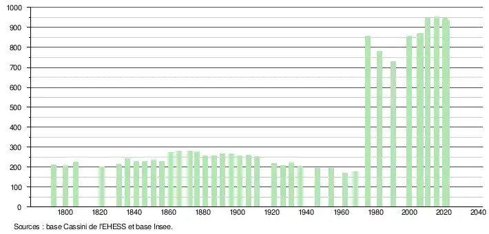 L'évolution du nombre d'habitants est connue à travers les recensements de la population effectués dans la commune depuis 1793. Pour les communes de moins de 10 000 habitants, une enquête de recensement portant sur toute la population est réalisée tous les cinq ans, les populations légales des années intermédiaires étant quant à elles estimées par interpolation ou extrapolation[23]. Pour la commune, le premier recensement exhaustif entrant dans le cadre du nouveau dispositif a été réalisé en 2005[24].
