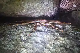 Il est relativement petit puisqu'il mesure jusqu’à 6 cm et sa carapace très plate lui permet de se dissimuler très facilement dans les anfractuosités des récifs.