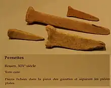 Pernettes fichées dans les trous triangulaires d'une casette, XIXe siècle, musée de la céramique de Rouen.