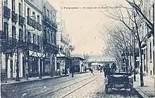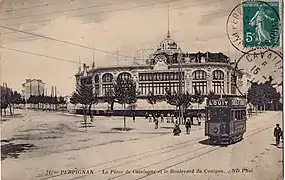 Vue du centre-ville de Perpignan. À gauche, la place de la Résistance, lieu de jonction du boulevard Georges-Clemenceau et du boulevard Wilson. Au centre droit, le Castillet (El Castellet). La rivière la Basse, petit affluent du fleuve côtier la Têt est longée par le quai Sadi-Carnot (à gauche) où se trouvent la préfecture et le conseil départemental, et à droite le quai Vauban et ses commerces.