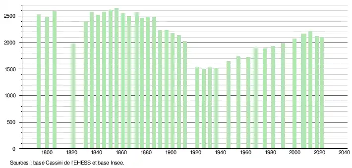L'évolution du nombre d'habitants est connue à travers les recensements de la population effectués dans la commune depuis 1793. Pour les communes de moins de 10 000 habitants, une enquête de recensement portant sur toute la population est réalisée tous les cinq ans, les populations légales des années intermédiaires étant quant à elles estimées par interpolation ou extrapolation[16]. Pour la commune, le premier recensement exhaustif entrant dans le cadre du nouveau dispositif a été réalisé en 2007[17].