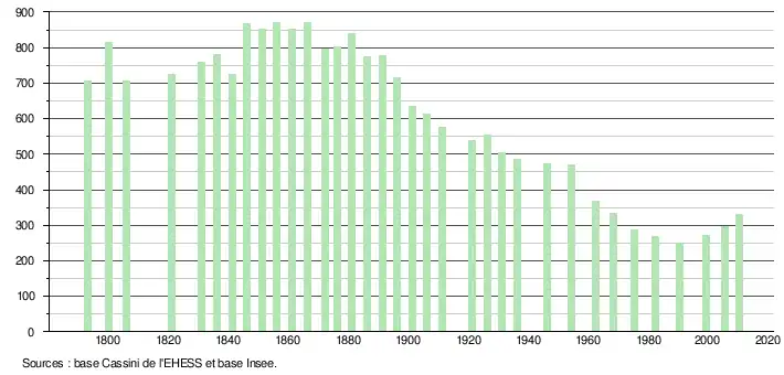 L'évolution du nombre d'habitants est connue à travers les recensements de la population effectués dans la commune depuis 1793. À partir du , les populations légales des communes sont publiées annuellement dans le cadre d'un recensement qui repose désormais sur une collecte d'information annuelle, concernant successivement tous les territoires communaux au cours d'une période de cinq ans. Pour les communes de moins de 10 000 habitants, une enquête de recensement portant sur toute la population est réalisée tous les cinq ans, les populations légales des années intermédiaires étant quant à elles estimées par interpolation ou extrapolation[14]. Pour la commune, le premier recensement exhaustif entrant dans le cadre du nouveau dispositif a été réalisé en 2005[15],[Note 6].