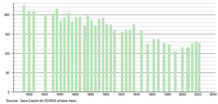 L'évolution du nombre d'habitants est connue à travers les recensements de la population effectués dans la commune depuis 1793. Pour les communes de moins de 10 000 habitants, une enquête de recensement portant sur toute la population est réalisée tous les cinq ans, les populations légales des années intermédiaires étant quant à elles estimées par interpolation ou extrapolation[15]. Pour la commune, le premier recensement exhaustif entrant dans le cadre du nouveau dispositif a été réalisé en 2007[16].