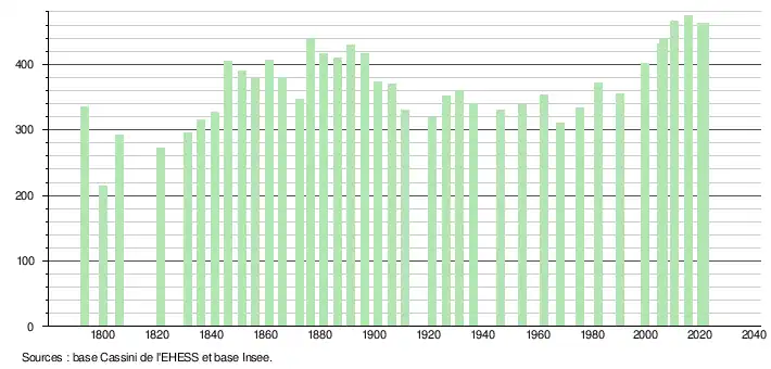 L'évolution du nombre d'habitants est connue à travers les recensements de la population effectués dans la commune depuis 1793. Pour les communes de moins de 10 000 habitants, une enquête de recensement portant sur toute la population est réalisée tous les cinq ans, les populations légales des années intermédiaires étant quant à elles estimées par interpolation ou extrapolation[22]. Pour la commune, le premier recensement exhaustif entrant dans le cadre du nouveau dispositif a été réalisé en 2005[23].