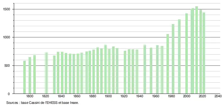 - Population municipale légale en vigueur au 1er janvier 2024, millésimée 2021, définie dans les limites territoriales en vigueur au 1er janvier 2023, date de référence statistique : 1er janvier 2021.
