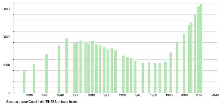 L'évolution du nombre d'habitants est connue à travers les recensements de la population effectués dans la commune depuis 1793. Pour les communes de moins de 10 000 habitants, une enquête de recensement portant sur toute la population est réalisée tous les cinq ans, les populations légales des années intermédiaires étant quant à elles estimées par interpolation ou extrapolation[18]. Pour la commune, le premier recensement exhaustif entrant dans le cadre du nouveau dispositif a été réalisé en 2008[19].
