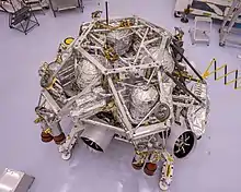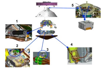 - et la dépose par l'étage de descente (Sky Crane) fonctionnant à la manière d'un hélicoptère-grue de l'astromobile sur le sol martien.